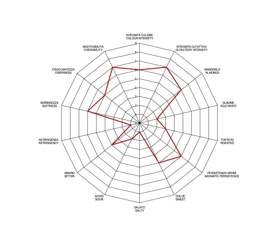 L’Amaretto di Guarcino, contraddistinto dalla forma ellittica, ha un colore marrone chiaro tendente al nocciola. L’elevata intensità olfattiva si caratterizza per le note di mandorle e albume abbinate a sentori di tostato. Al gusto si presenta armonicamente dolce e amaro con una leggera nota salata e acidula. Croccante e morbido al contempo, ha una media persistenza aromatica.