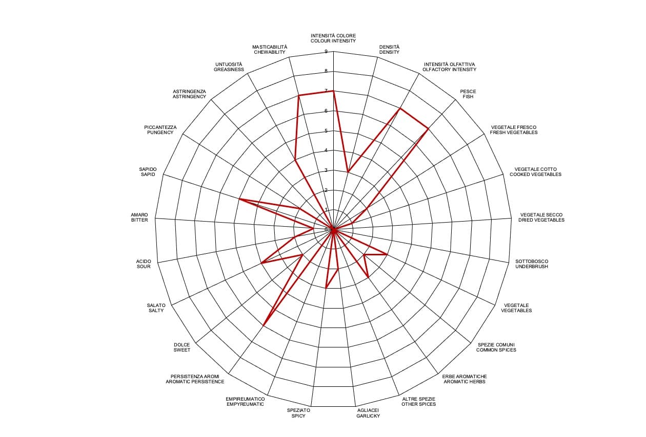 La Minestra dei pescatori anziati ha un colore arancione omogeneo. L’elevata intensità olfattiva si caratterizza per le spiccate note di brodo di pesce, vegetali di pomodoro e quelle speziate di peperoncino, aglio ed erbe aromatiche (prezzemolo). Al gusto si presenta armonicamente salato e sapido e con una leggera nota piccante. Buona la persistenza aromatica.