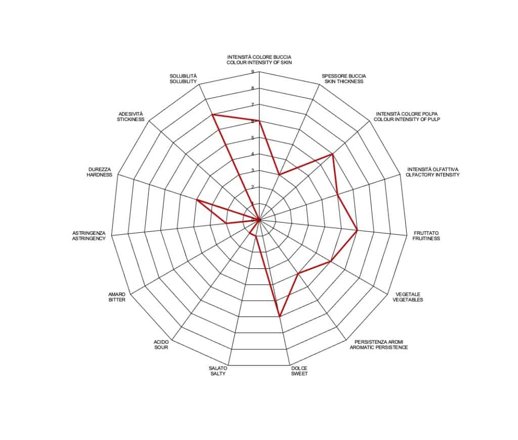 Il Pizzutello di Tivoli ha un colore giallo intenso ed uniforme. La media intensità olfattiva si caratterizza per le spiccate note fruttate tipiche dell’uva matura e sentori vegetali. Al gusto si presenta dolce con una delicata nota acidula. La polpa è carnosa e croccante. Media persistenza aromatica.